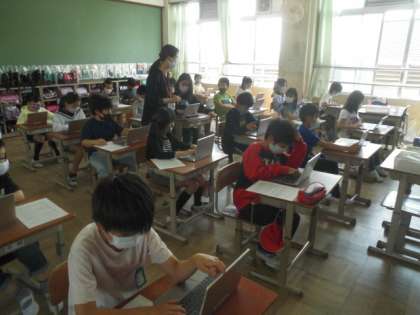 社会科の学習では,それぞれがパソコンをつかって「京都市の町並」について調べました。自分たちが住む街をマップで見ることで,あらためて京都の町について興味をもつことができました。
