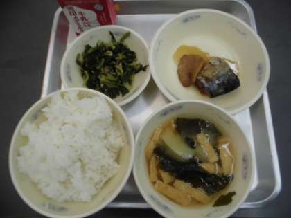 「ごはん」「みそしる」「牛乳」「だいこん葉の炒めもの」「さばのしょうが煮」です。