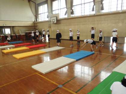 体育の学習で,マット運動に取り組んでいます。正確に連続技ができるようになることを目標に取り組んでいます。今日は,新しい技にチャレンジしました。