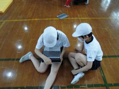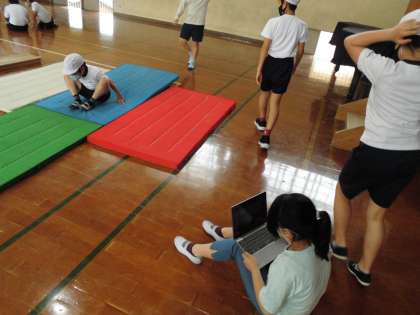 新しい技に何度も繰り返しチャレンジしていました。また,タブレット端末で技を動画撮影し,自分の様子を見て,改善ポイントを分析したり,友達とアドバイスをしあったりしていました。自分が技をしている様子を可視化することで,どんどん上達していました!