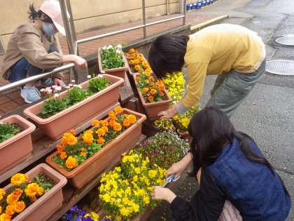 下の写真は園芸委員のみなさん。こちらも朝から花の世話を頑張っていました。きれいに咲いた花を見ると,気持ちも明るくなりますね。