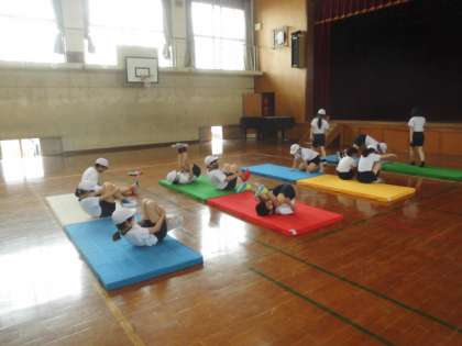 体育科の学習では,マット運動をしています。ねらい1では「今,自分ができる技」に挑戦し,ねらい2では「少しがんばればできそうな技」に挑戦しています。前転,後転,開脚前転,側転などそれぞれが一生懸命技に挑戦しています。連続技にもどんどん挑戦をしています。