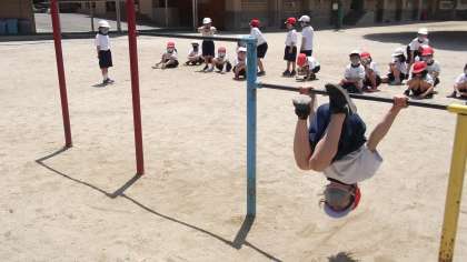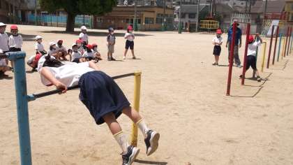 とびあがりやまえまわり,さかあがりなど様々な技に挑戦するかっこいい1年生の姿が見られました。お友だちのしているところを見て,上手にできているところをまねしたり「すごい!」や「上手にできているね」など優しい言葉をかけている場面がみられました。