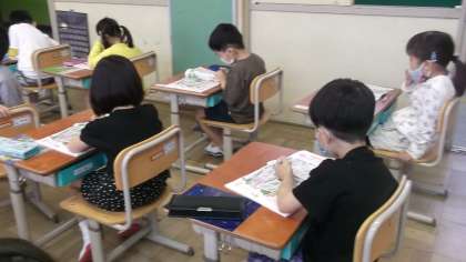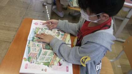学校の様子が描かれている絵を見て,よい行い,悪い行いをしている動物を見つけました。なぜよい行いなのか,悪い行いなのかを発表することができました。
