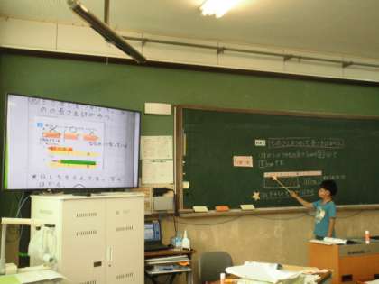 次に,クレヨンや鉛筆の長さが何cmかを,各自で調べました。その後,書画カメラのに挿絵をうつし,その絵を使って何cmであるかを発表しました。