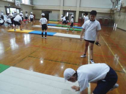 体育科ではマット運動をしました。開脚前転,後転など自分の目標に向かっていろいろな技に挑戦をしました。