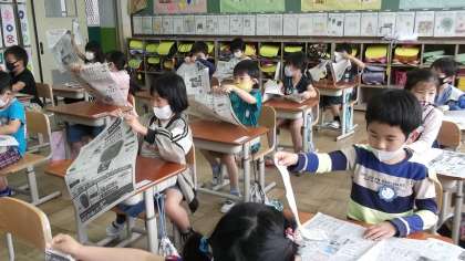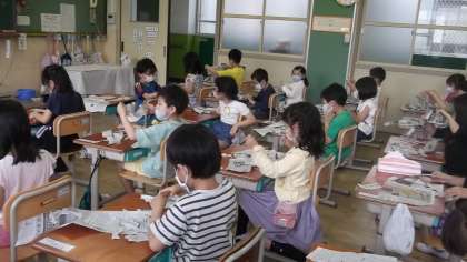 新聞紙をやぶいてできた形が何に見えるかを考えました。