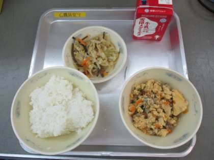ごはん,ごま酢煮,他人煮,牛乳です。