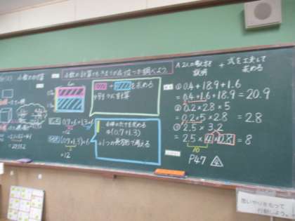 「足し算の順番を入れ替えても答えが変わらない方法」や「25×4=100など,計算しやすい数を作って計算する方法」など,4年生の学習も思い出しながら,計算式を変形して,簡単に計算することができる方法を考えていました。