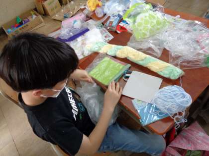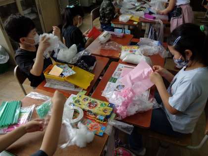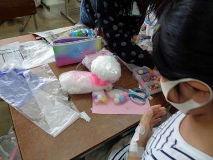 紐をほどいて入れたり,お花紙を丸めて入れたり,思い思いに表現していました。