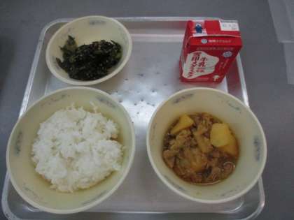 ごはん,肉じゃが(カレー味),小松菜とひじきの炒め物,牛乳です。