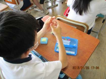家庭科「ひと針に思いをこめて」では,初めて裁縫セットの道具を使っいました。今日は玉結びをしました。