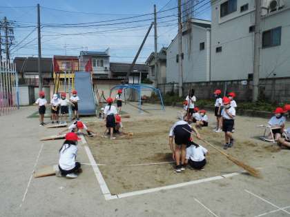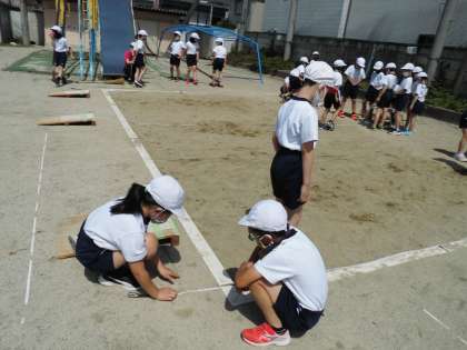 先日は跳び方の学習だけをしたのですが,今日はいよいよ本格的に体育科「はばとび」の距離を測定する学習が始まりました。