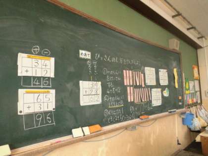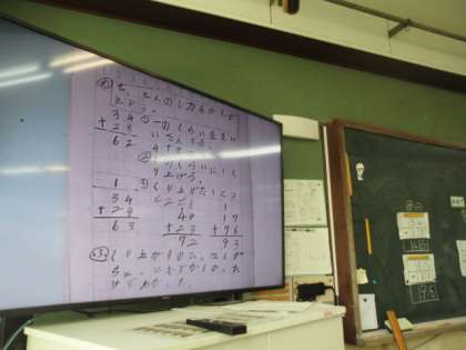 算数科でくり上がりのあるたし算のひっ算の学習をしました。