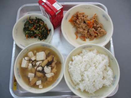ごはん,もずくのみそしる,だいこん葉のごま炒め,おからツナどんぶりの具,牛乳です。
