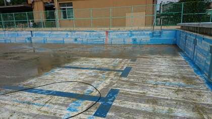 昨年度も実施できていないので,プールは2年間の汚れがたまっています。水を抜いて,ブラシや機械を使って汚れを落としていきます。
