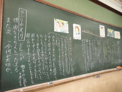 今日は「あこがれの人」というお話を通して,用事があるのに友達から誘われたらどんな気持ちになるか,そんな時どうしていこうと思うかを考えました。