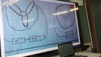 理科の学習で電池を使った実験を行いました。前回の授業で,電池を使ってモーターを回した子どもたち。もっと,速くモーターを回すにはどうすればいいか話合い,電池を2個使って実験することにしました。