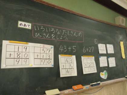 1けた+2けた,2けた+1けたなど,マスに書くときどのように書けばいいのかみんなで考えてから,計算しました。十の位に1くり上がるときには,10の位の上にくり上がりの1を書くことも,もう1度確認しました。