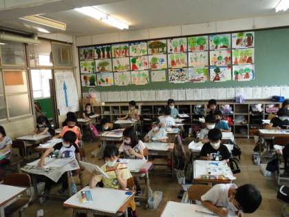 今日は図画工作科「わたしの6月の絵」に取り組みました。先週,6月を思い浮かべるものや形・色・物を書き集め,今日はそれを参考にしながら,自分の6月を描き始めました。