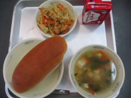 味つけコッペパン,豆腐と青菜のスープ,ソーセージと野菜の炒めナムル、牛乳です。