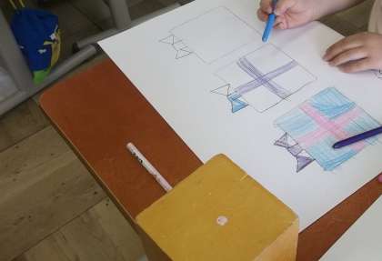 積み木の面に沿って,丁寧に形をとりました。写した形を使って,絵をかきました。いろいろな絵を描くことができました。