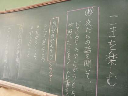 今日の国語科「こまを楽しむ」の学習では,昨日,本文に出てきた六つのこまの中から一番遊んでみたいものを選び,ノートに書いたものをグループで発表しました。そして,友達の話を聞いて,自分の感想と似ているところや違うところ,思ったことをノートに書きました。
