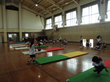 今日は,ゆりかごから後ろ回りをしたり,自分のできる技を組み合わせて回ったりしました。後ろ回りは,少し難しいですが,ゆりかごの練習をするうちに,イメージをつかんだのか,できる子が増えてきました。