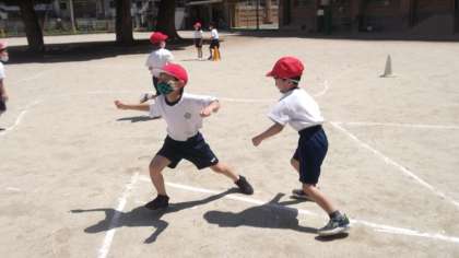 ジグザクの線や曲線の上を走って向かいにいる友達とドンじゃんけんをしました。勝ったら進んで,相手の陣の中に入ったら勝ちです。
