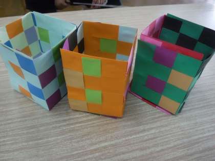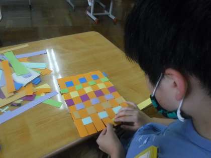 切れ込みを入れた色画用紙に,細長くカットした色画用紙を格子状に編んでいき,ペン立てを作りました。