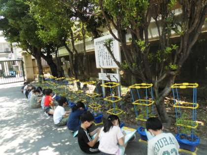 みんな,日陰にミニトマトの植木鉢を持って行って,しっかり観察して,ワークシートに絵や気が付いたことをかきました。