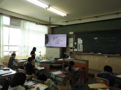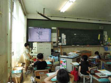 ミニトマトの観察をした後,教室に帰って,TV画面に自分のかいたミニトマトの絵を映し,気が付いたことを発表しました。