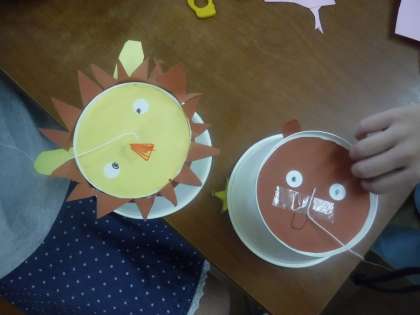 より楽しくするために紙コップに画用紙を貼って,ライオンやクマ,ウサギなどの顔に見立てて糸電話を作りました。