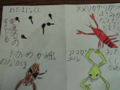 生活科の時間に水辺の生き物のDVDの映像を見ながら,生き物の絵をかいたり,わかったことをかいたりしました。時々,一時停止ながら絵をかいていくのが,とても楽しかったようです。
