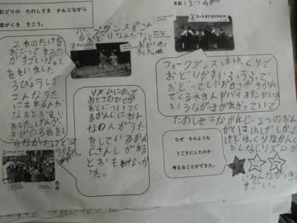 子どもたちは,フィリピンや沖縄やデンマークの楽しい踊りの曲を,体をゆらしながら聴いていました。「〇びょうしや。」とつぶやきながら,ワークシートに感じたことをかいていました。発表も意欲的にしていました。
