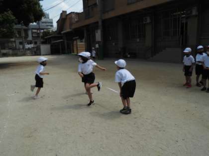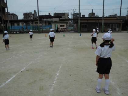 まず,はじめは,二人でジャンケンをします。パーで勝つと「パイナップル」,チョキで勝つと「チョコレート」,グーで勝つと「グリンピース」と言葉の数だけ大股でとび,進むことが出来ます。はじめはスキップをしてしまう人が多かったですが,何度もするうちに腕を振って,膝を曲げてぐんぐん進むことが出来ました。