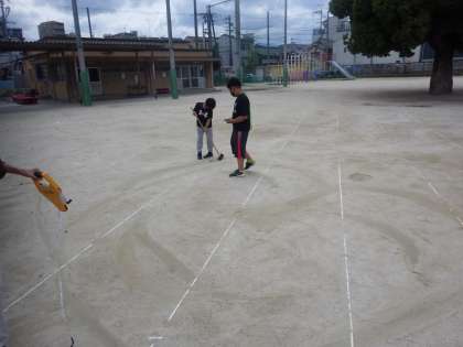 奈良時代の学習が始まりました。この時代に作られた大仏の大きさを体感するために,運動場に大仏の絵を描いてみました。写真は顔の部分です。(見えますか?)