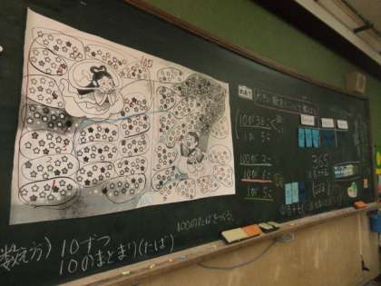 最後に,もう一度,黒板の掲示物でも,星は全部で365個あることを確認し,練習問題に3問チャレンジしました。