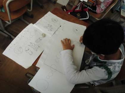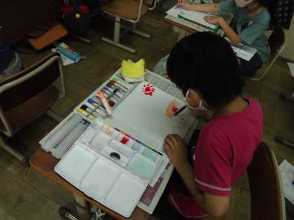 今日の図画工作科では,先週に引き続き「「ひらいて広がるふしぎなせかい」を考え,つくりました。アイデアスケッチの後,試作品つくり,いよいよ今日は画用紙を使って本番!絵を描いた後,絵の具で色を作ったり,細かなところも集中して丁寧に描いていました。どんなひらいて広がる世界ができるのか楽しみです!