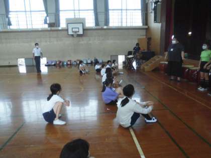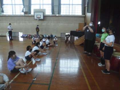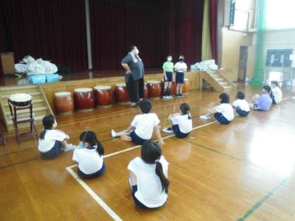 「和太鼓」では,講師の先生に来校いただき基礎基本から教えていただきました。両手でバチを持ち,同じリズムをきざみ続けることは大変難しく「モモ・リンゴ・マスカット」など言葉に置き換えて楽しくリズムをきざむ技を教えていただきました。