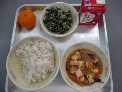 今日の献立は、むぎごはん,豆腐の四川風,ほうれんそうともやしのいためナムル,みかん,牛乳です。