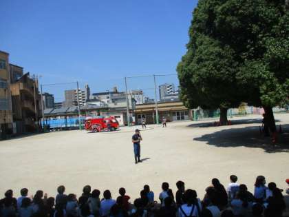 中堂寺消防出張所の皆様にご協力いただき,火災を想定した避難訓練を行いました。