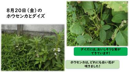 みなさん,元気にしていますか。お休みの間もみんなが理科で育てている植物は,運動場で元気にすくすく育っています。来週,学校に来た時に,自分の目でしっかり観察してくださいね!