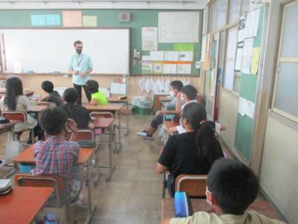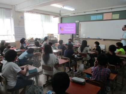 外国語の授業では,アンドリュー先生が夏休みについて話してくれました。