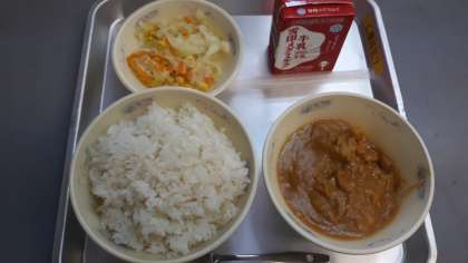 9月3日(金)今日の給食は「胚芽米ごはん」「牛乳」「チキンカレー」「野菜のソテー」でした。あいにくの雨でしたが,カレーの香りがしてくると,子どもたちもとてもうれしそうでした。じっくり煮込んだ手作りのルーが,おいしさの秘密です!!