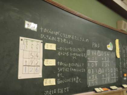 まず,次に,最後にという言葉を使って,計算のやり方を説明する練習をしました。たし算の筆算(1)の学習をしているので,説明はスムーズに言えていました。