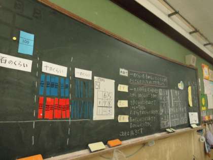 数え棒も使って,「まず 次に 最後に」という言葉をつかいながら,わかりやすく説明する練習をしました。二回くり上がるのは難しい計算ですが,みんな意欲的に問題を解いていました。