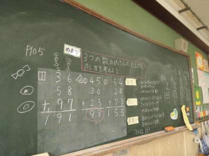 今日の算数の時間に「3つの数のたし算の筆算の仕方を考えよう。」という目あてで学習しました。