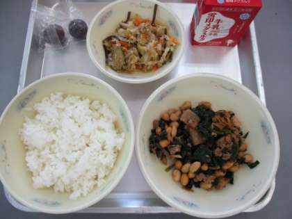 今日の献立は,ごはん,肉みそいため,ごま酢煮,ぶどう,牛乳です。