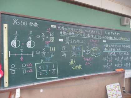 今日の算数科「分数」の学習では,『約分』について学びました。18/24を約分するための方法や約分するときのきまりについて,考えたことを交流し,お互いの考えを深めあっていました。